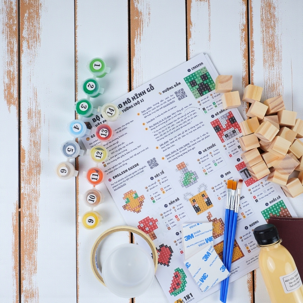 Kit Tự Làm Tranh Minecraft Treo Tường (sử dụng gỗ to 2x2x2 cm) là sản phẩm thuộc dòng STEAM DIY, được sản xuất thủ công bởi 1x1 Studio. Sản phẩm cho phép bạn tạo ra 2 vật phẩm trong 12 mẫu chỉ với 2 bước DIY: tô màu gỗ & lắp ghép gỗ.