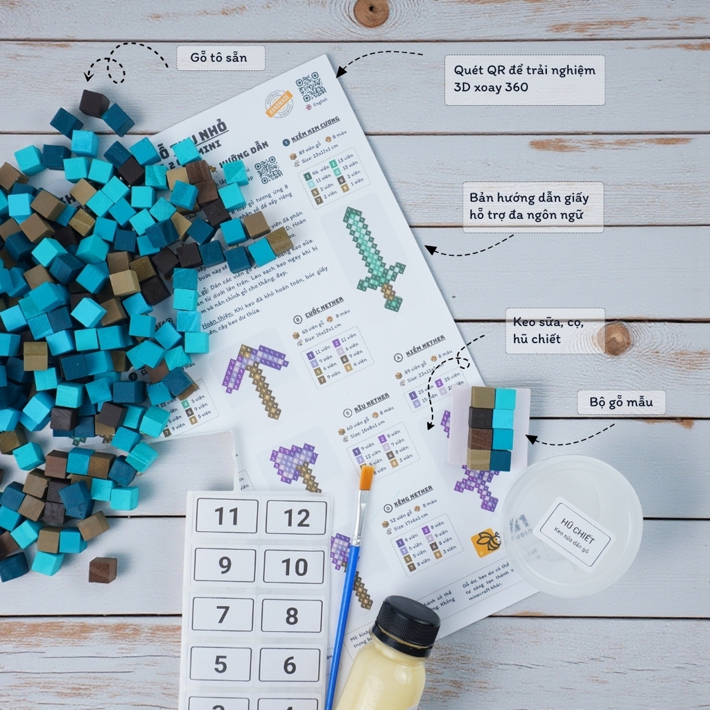 Bằng việc sử dụng gỗ nhỏ (1x1x1 cm) sẽ giúp làm được nhiều mẫu trang bị hơn, dễ thao tác hơn so với bộ sử dụng gỗ to (2x2x2 cm). Mô hình trang bị sau khi hoàn thành nhỏ, đẹp phù hợp trưng bàn học, bàn làm việc hoặc treo tường..