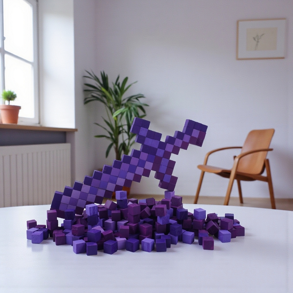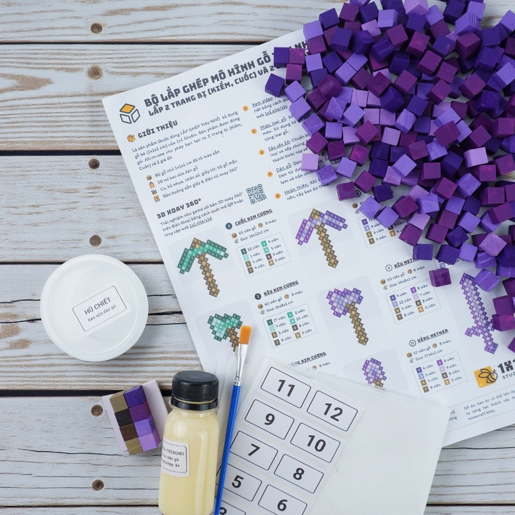 Bộ Lắp Ghép 2 Mô Hình Trang Bị Minecraft Kim Cương / Netherite THU NHỎ (sử dụng gỗ nhỏ 1x1x1 cm đã tô sẵn) là sản phẩm thuộc dòng LẮP GHÉP GỖ của 1x1 Studio. Sản phẩm cho phép bạn lắp ghép 2 trong 4 mẫu trang bị: Kiếm, Cuốc, Xẻng, Rìu và 2 giá đỡ mini.