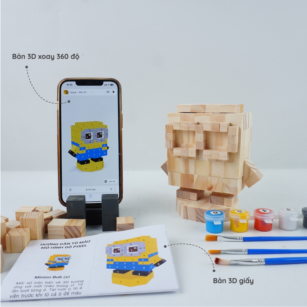 DIY Kit Tô Màu Mô Hình Gỗ Bob Minion được sản xuất thủ công bởi Xưởng 1x1. Sản phẩm gồm mô hình mộc, màu pha sẵn, cọ. Người dùng dễ dàng hoàn thiện sản phẩm với bản hướng dẫn bằng giấy hoặc trải nghiệm thú vị như chơi game với bản hướng dẫn điện tử xoay 360°.