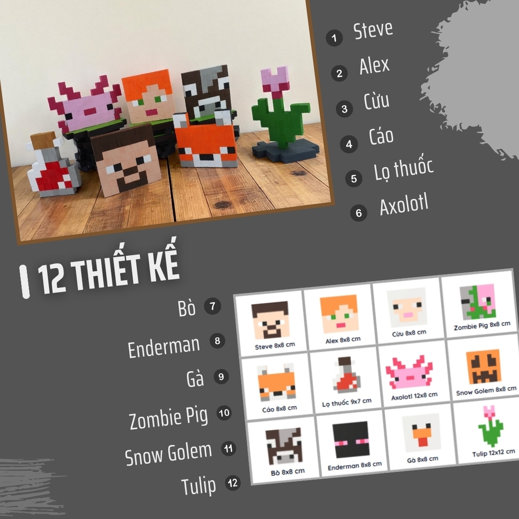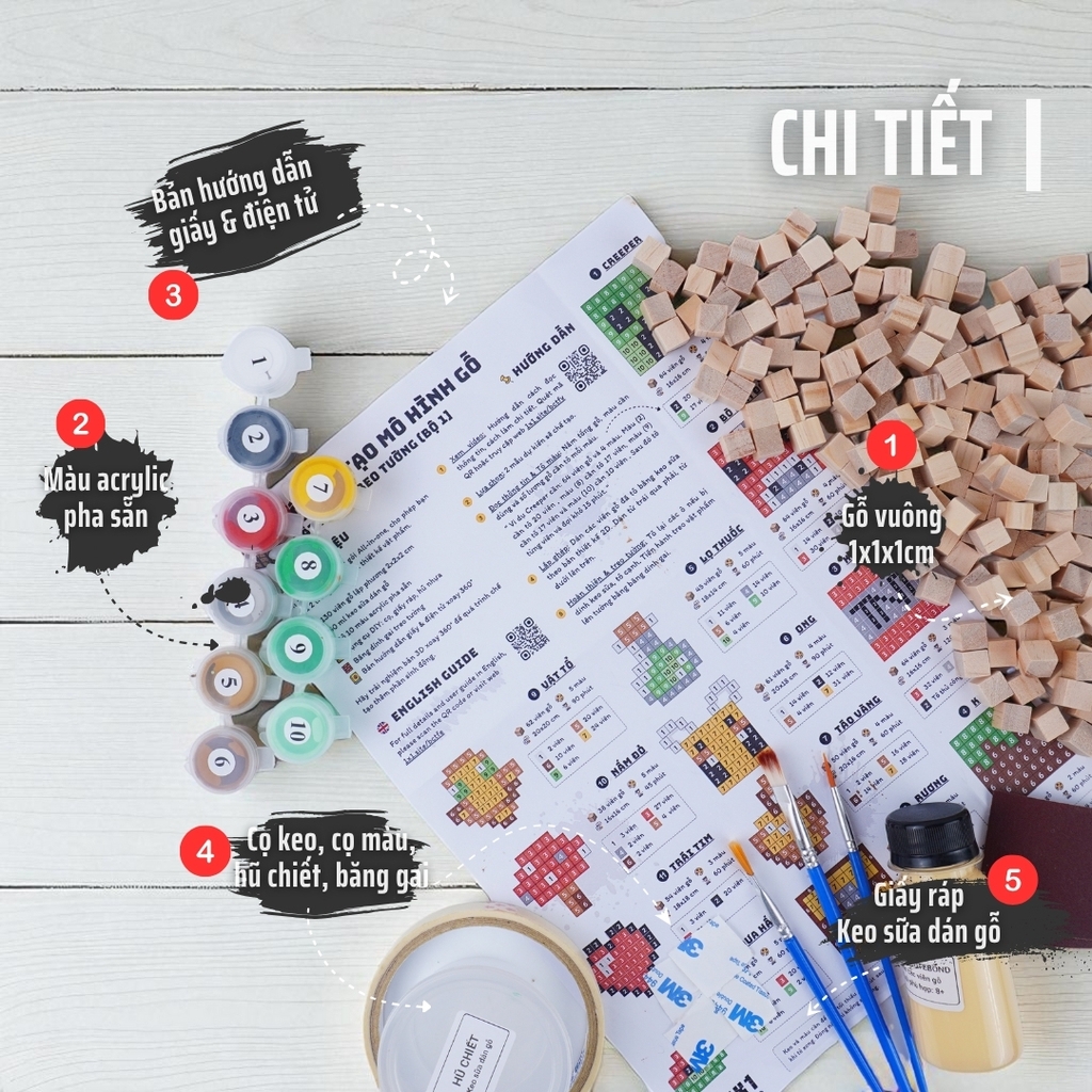 Bằng việc sử dụng gỗ nhỏ (1x1x1 cm) sẽ giúp làm được nhiều mẫu vật phẩm hơn, dễ thao tác hơn so với bộ sử dụng gỗ to (2x2x2 cm). Mô hình sau khi hoàn thành nhỏ xinh, phù hợp trưng bàn học, bàn làm việc hoặc treo tường.