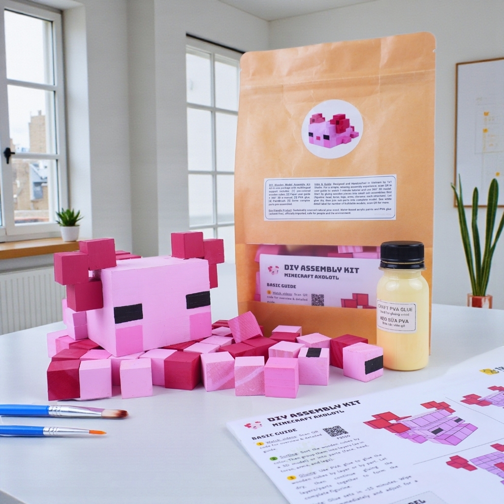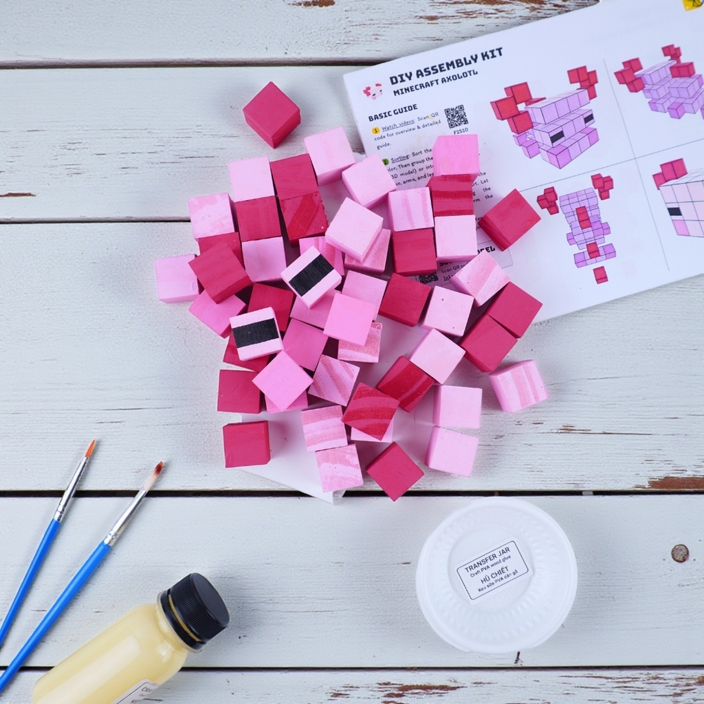 Bộ Lắp Ghép Mô Hình Gỗ Minecraft Axolotl (sử dụng gỗ lớn 2x2x2 cm đã tô sẵn) là sản phẩm thuộc dòng LẮP GHÉP GỖ của 1x1 Studio.